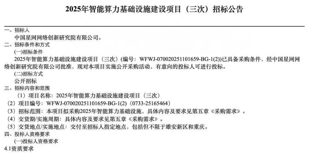 2026年1月21日,中国星网网络创新研究院有限公司发布2025年智能算力基础设施建设项目(三次)招标公告。