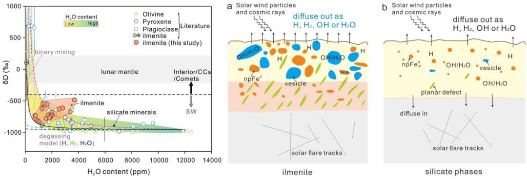 月表水演化新发现。空间中心太阳活动与空间天气重点实验室研究团队对嫦娥五号月壤中的钛铁矿颗粒表面风化层开展了水含量、H同位素组成以及微观结构分析。研究发现,钛铁矿表层保存的太阳风成因水显著低于硅酸盐矿物。首次阐明了钛铁矿影响月表水演化的两个关键机制:一方面显著促进太阳风成因水的生成;另一方面却难以维持该水的长期稳定保存。